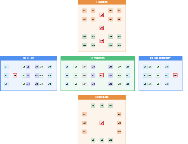 Leviticus sits at the crucial intersection point where these threads meet, binding the entire structure together. This arrangement isn't random—it reflects deep thematic and structural connections between the books.